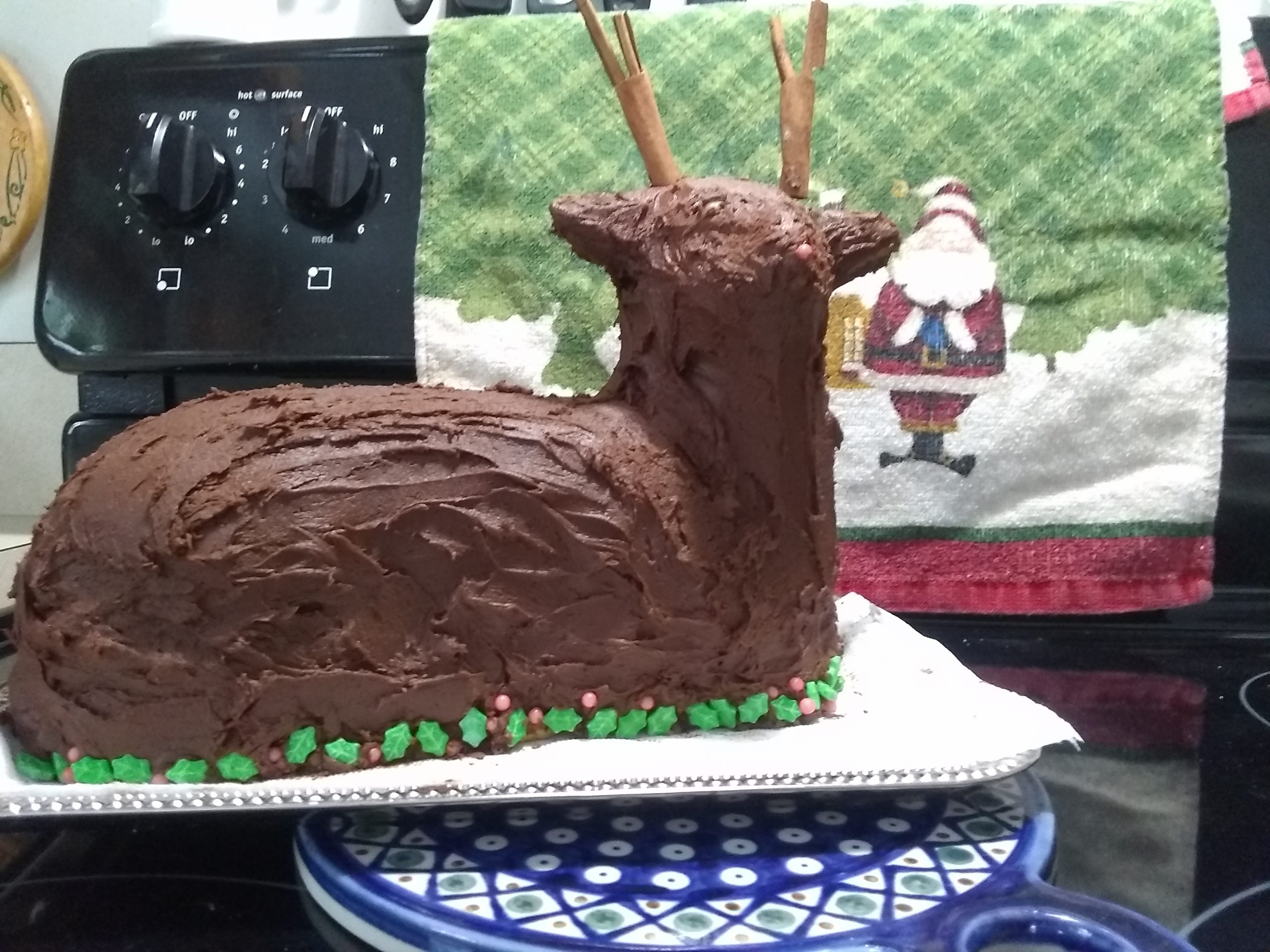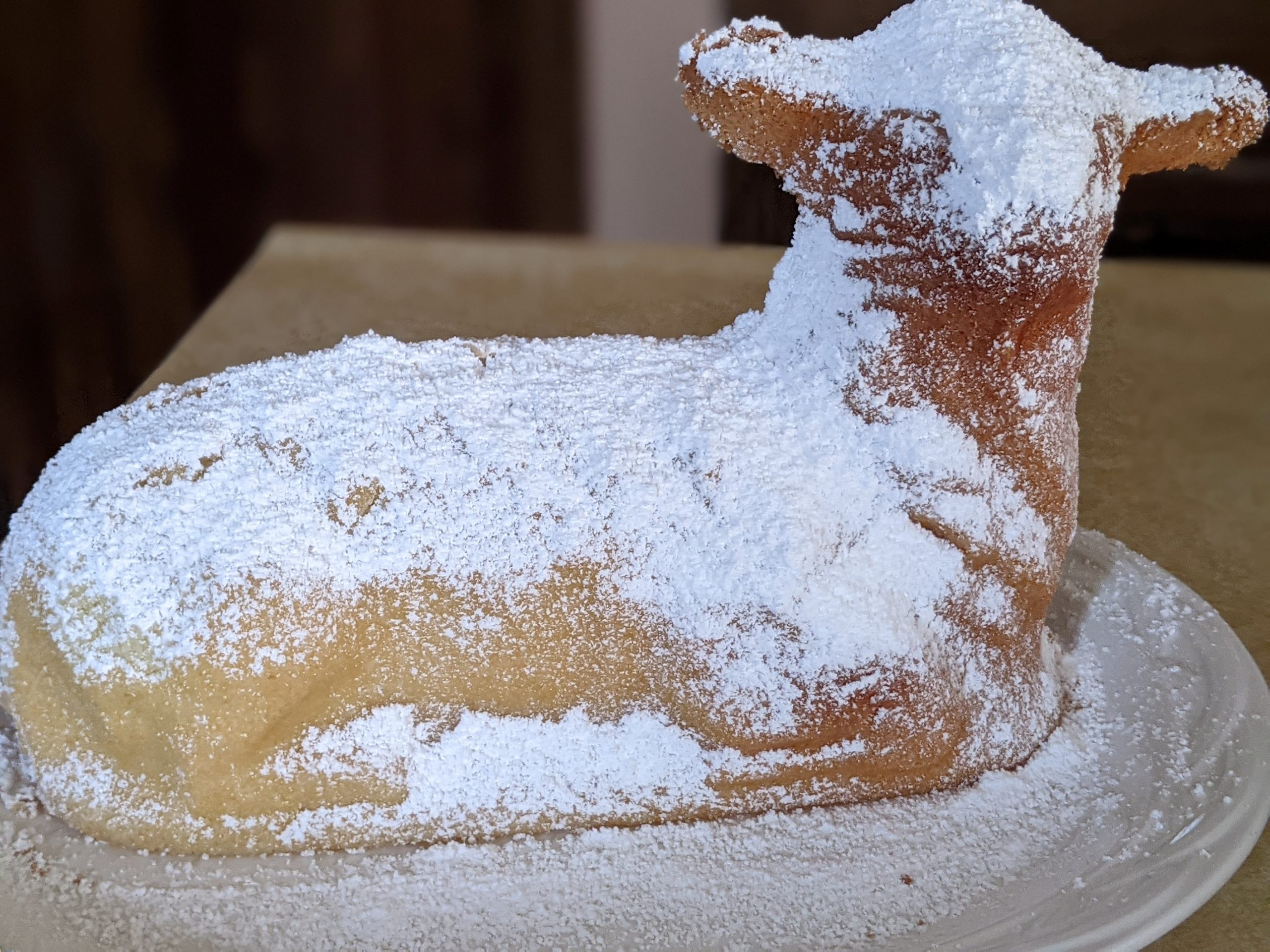 - Julie – Thank you for continuing the annual contest. Love all the great instructions and information on making the Lamb cakes. Due to Covid I did not make a cake last year for Easter but did make a reindeer for Christmas (photo attached) and made two lambs for Easter.