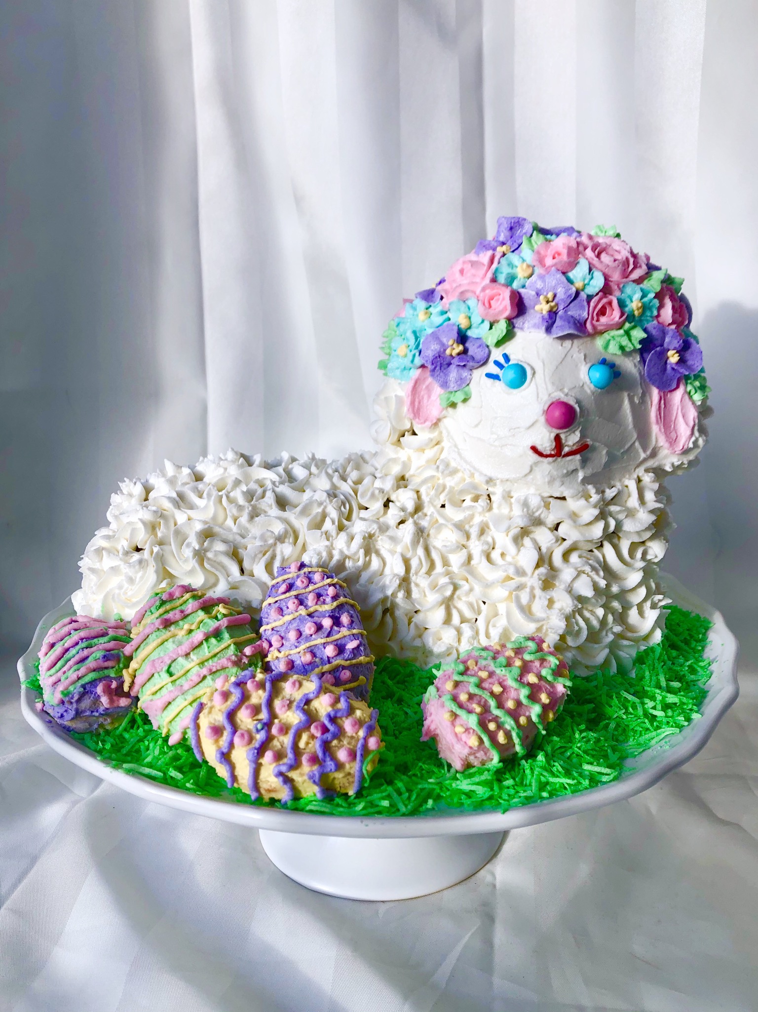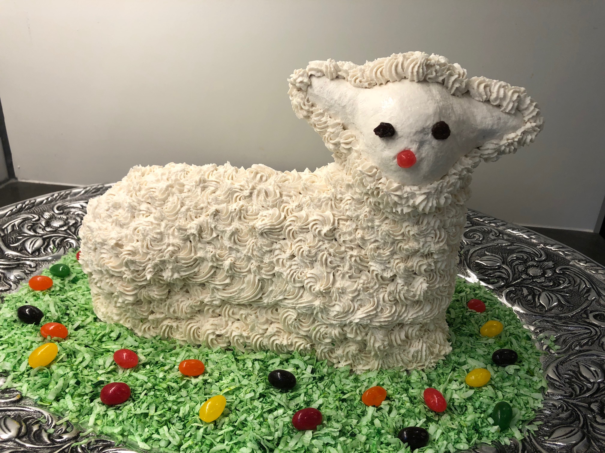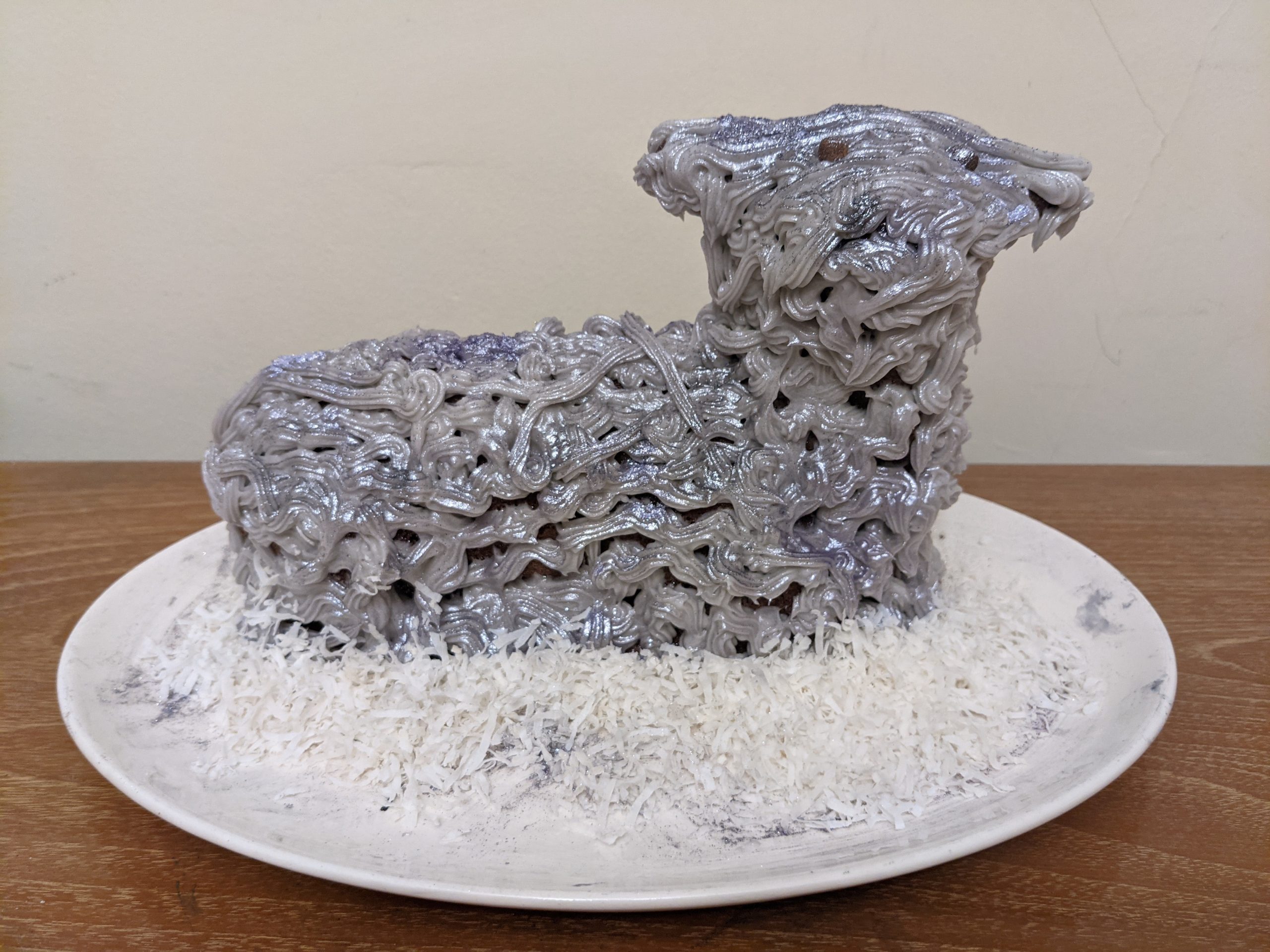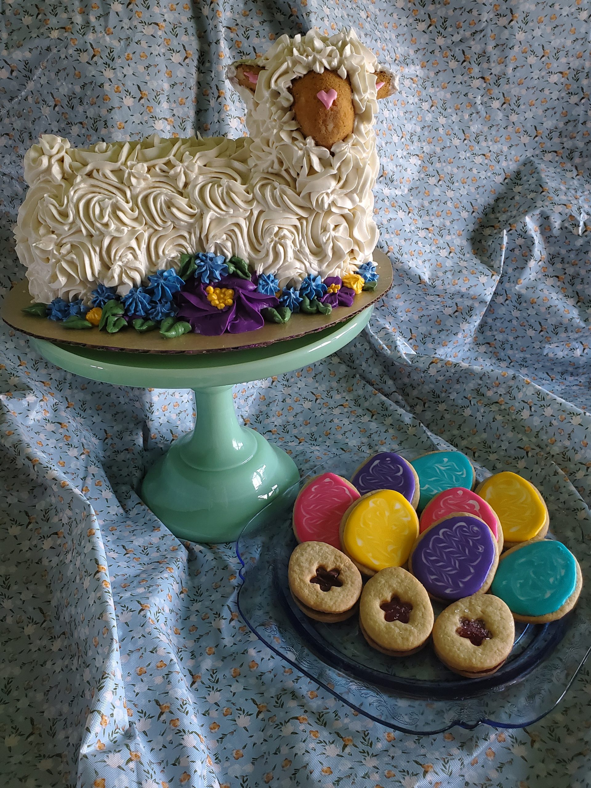 - Sarah Zaccardi – The recipe was a vintage pound cake recipe that came with the tin, so it’s been tried and true a few times before. The buttercream didn’t want to set and was melting off the lamb, but a layer of coconut fixed that right up. And of course, the lamb has some cookie friends.