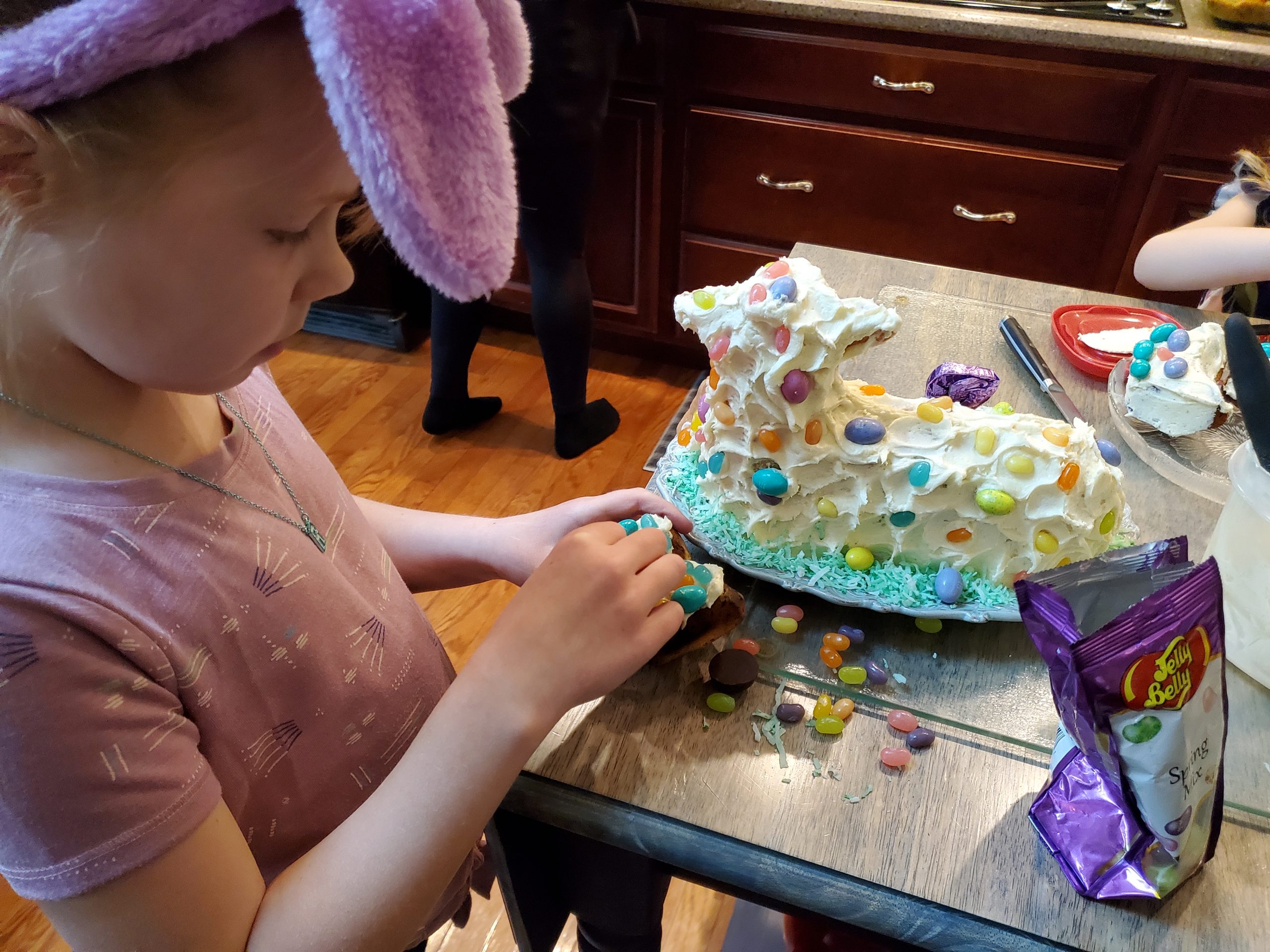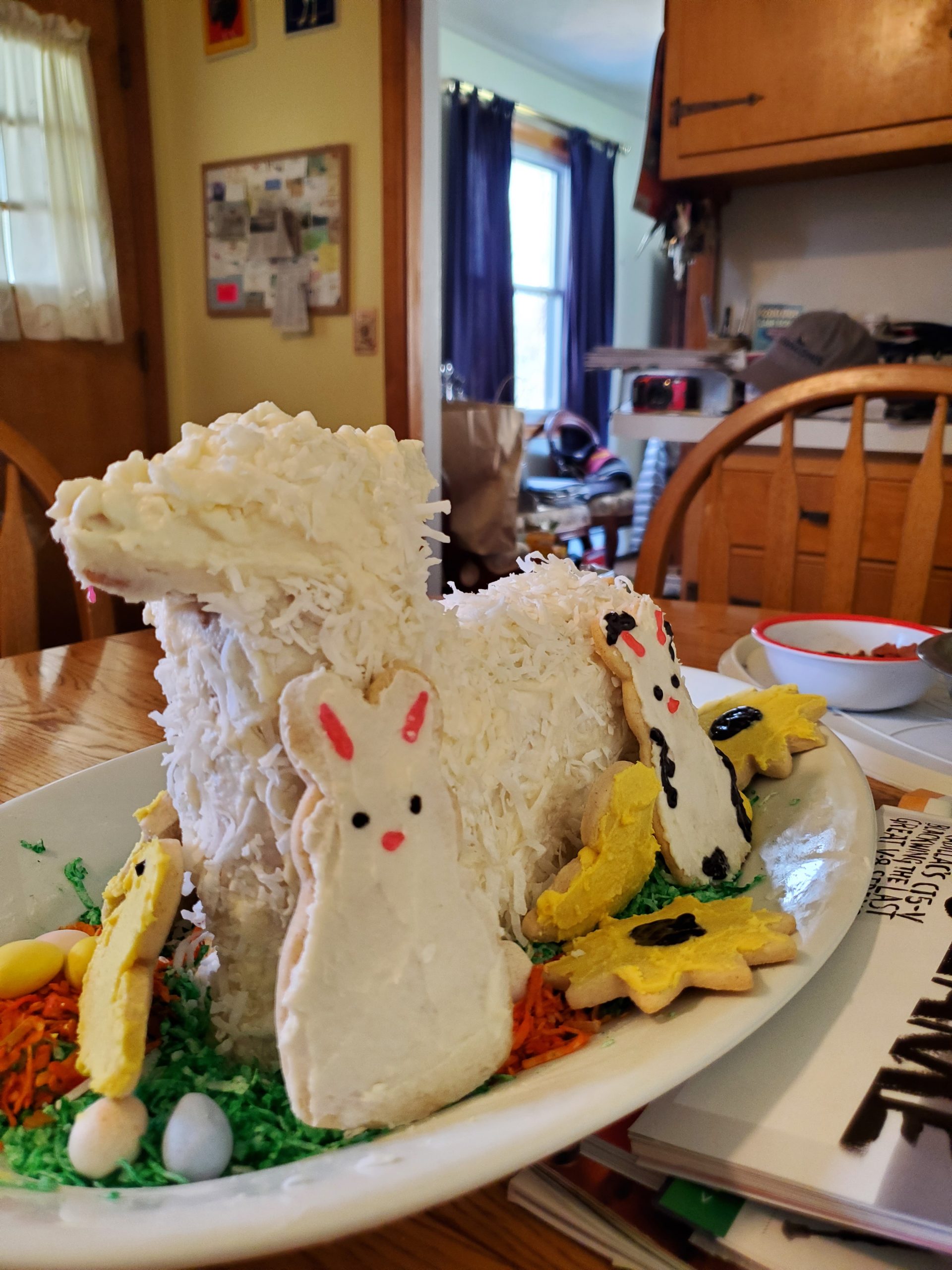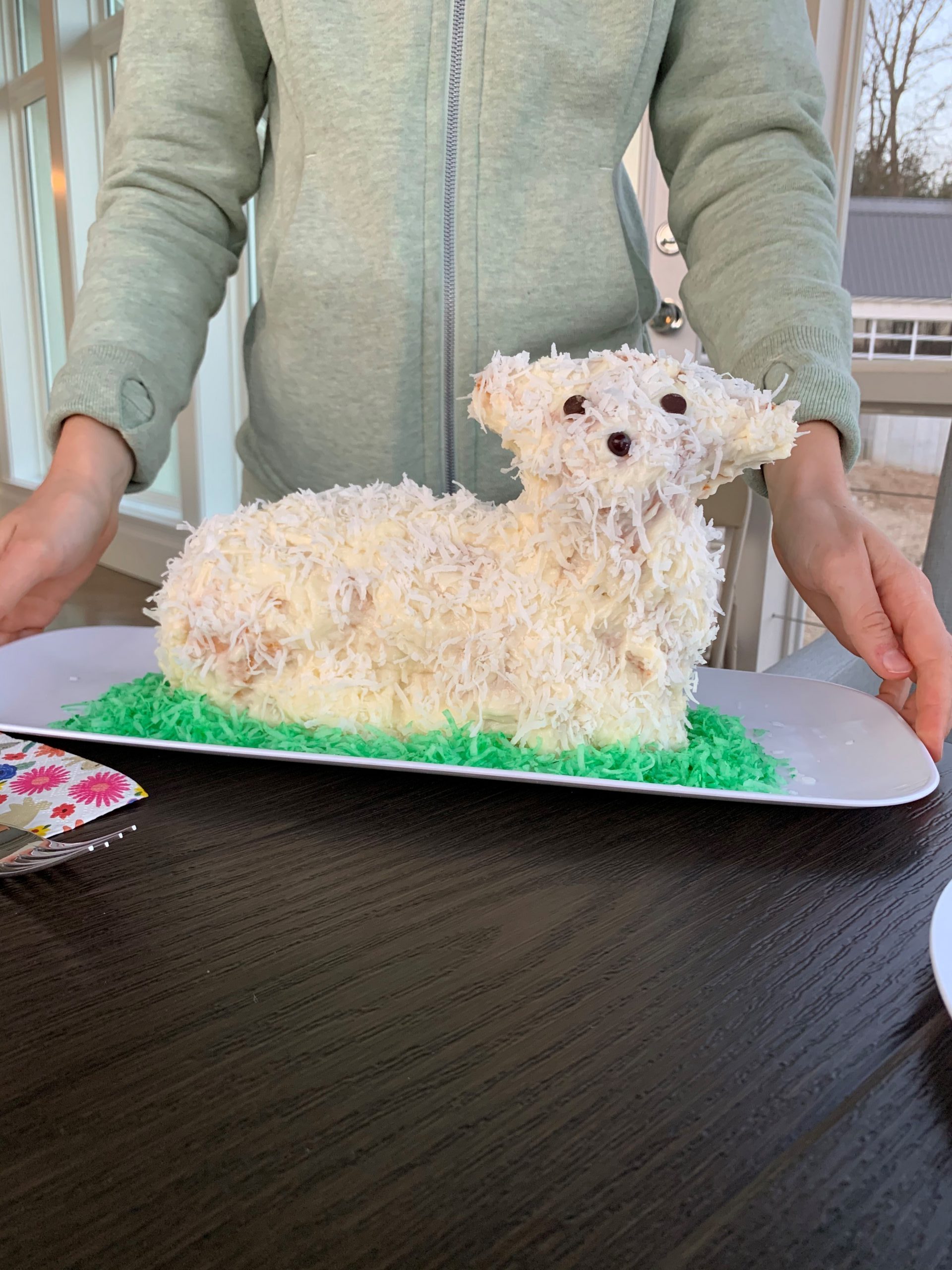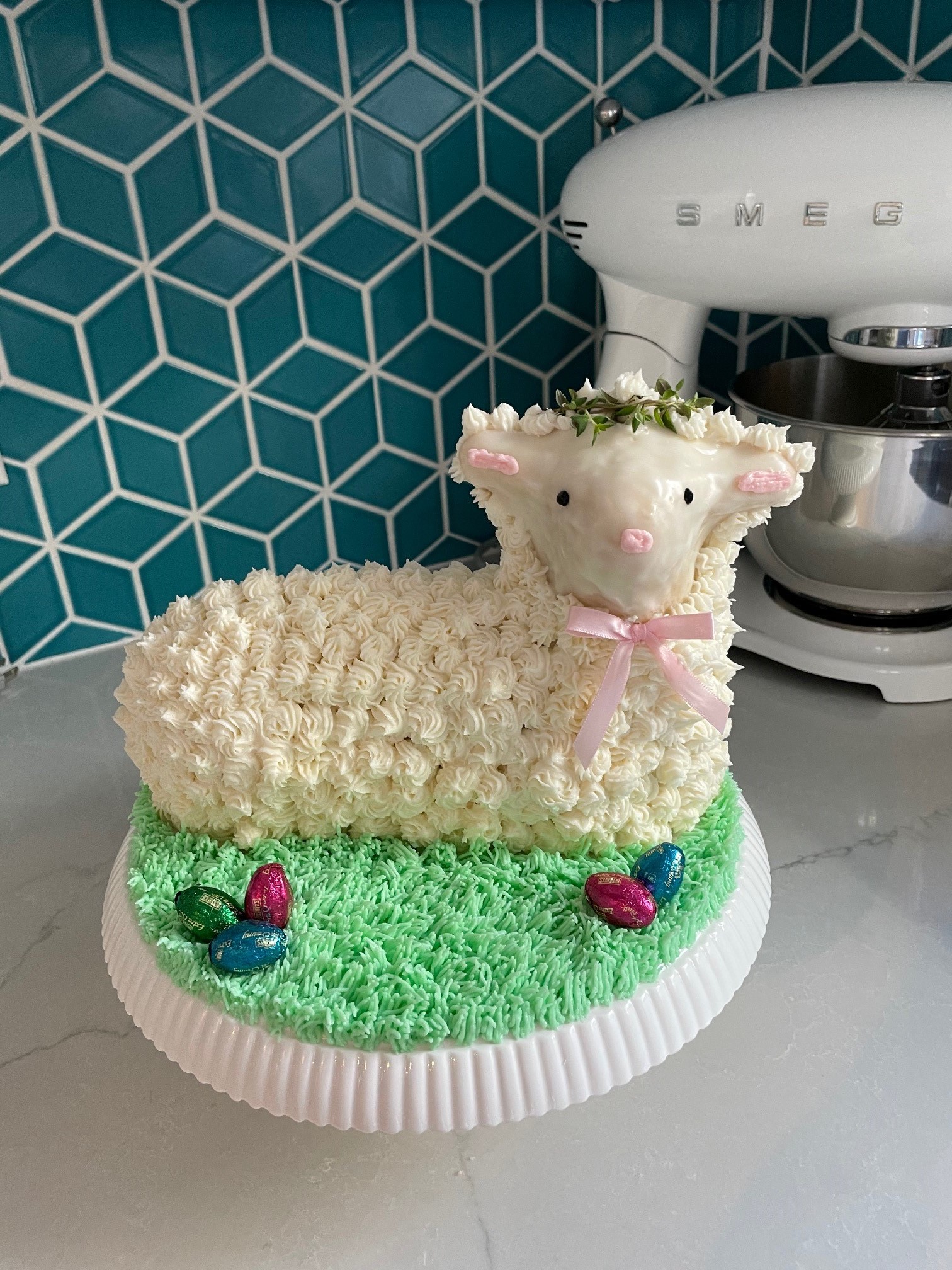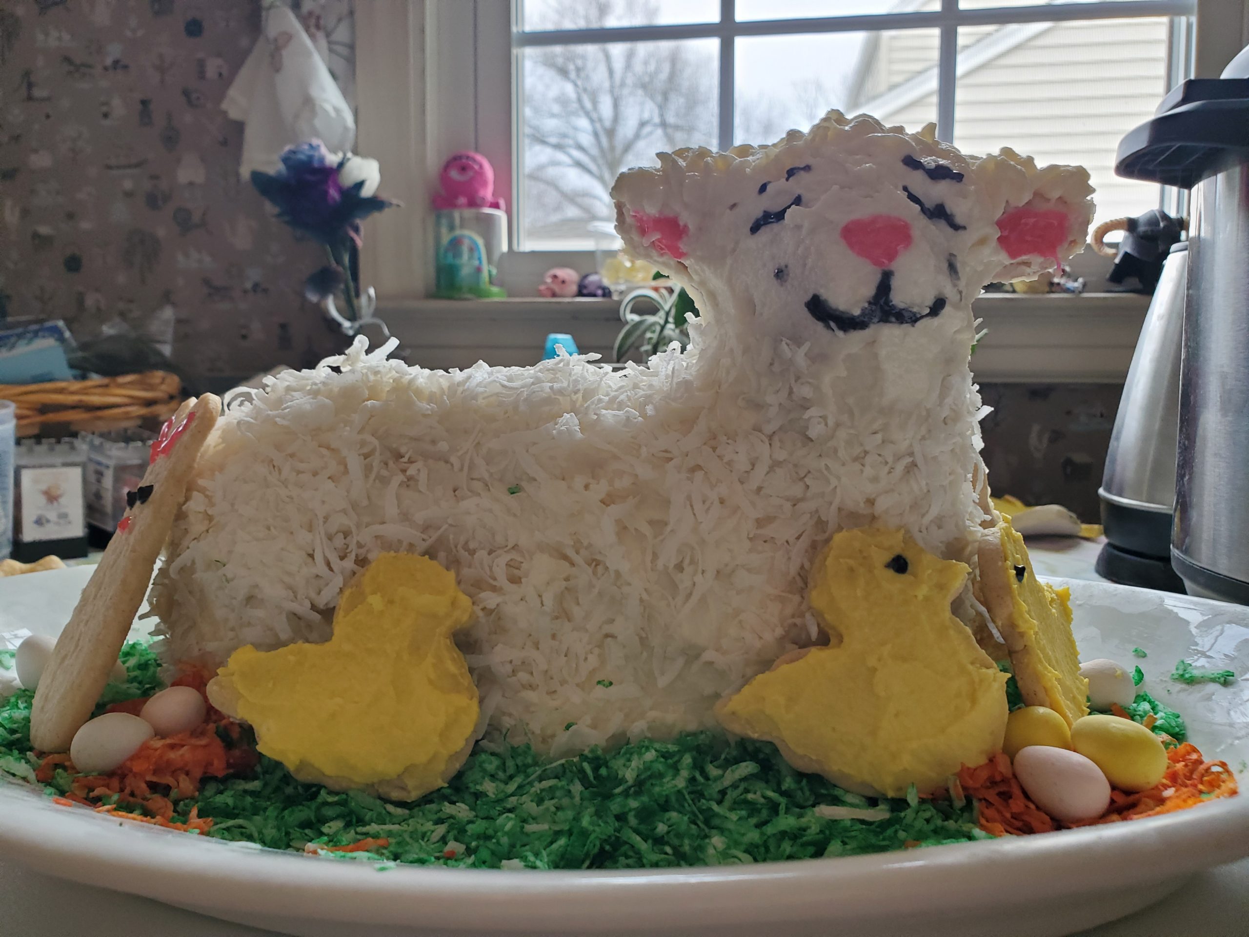 - Sarah Zaccardi – The recipe was a vintage pound cake recipe that came with the tin, so it’s been tried and true a few times before. The buttercream didn’t want to set and was melting off the lamb, but a layer of coconut fixed that right up. And of course, the lamb has some cookie friends.
