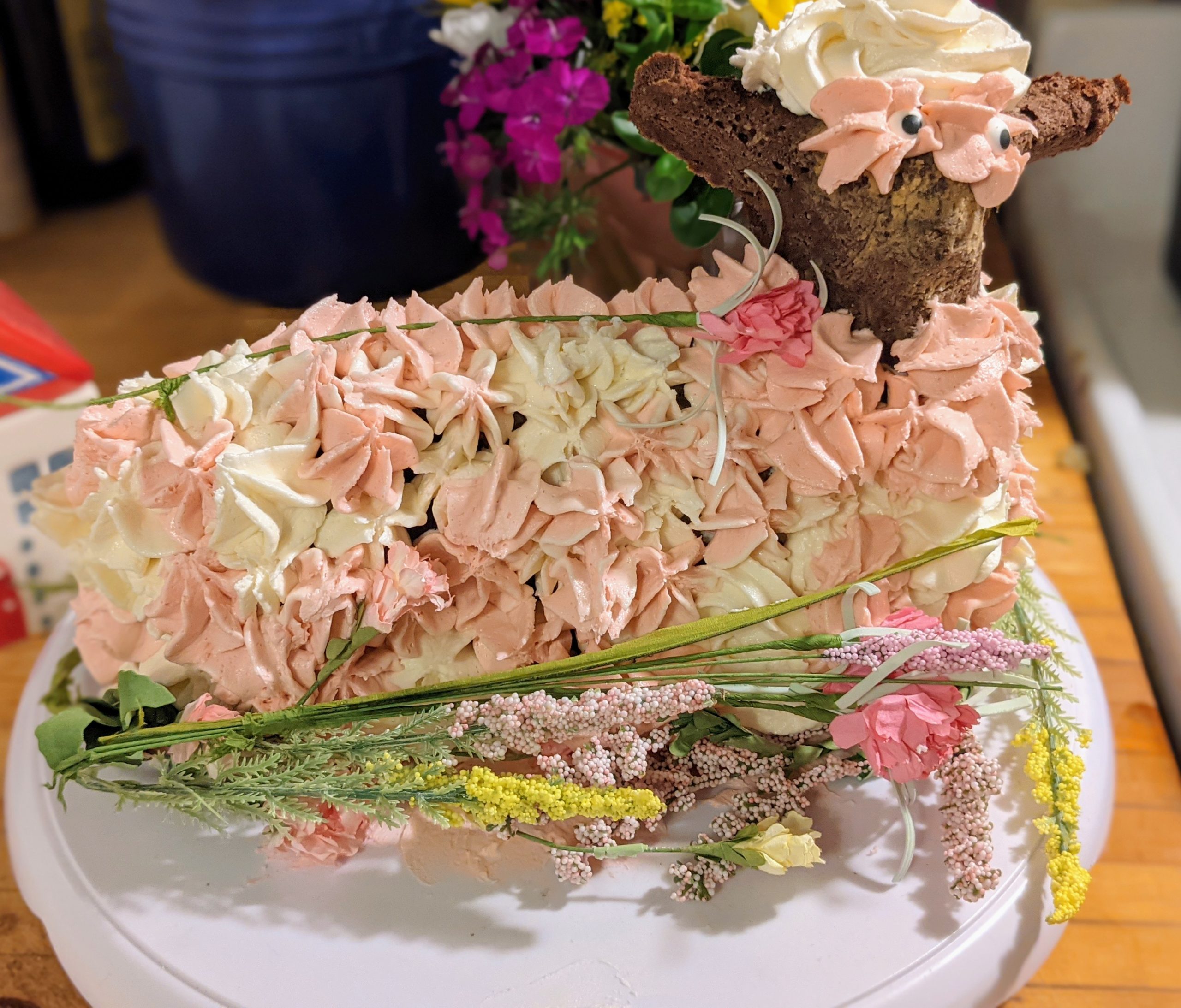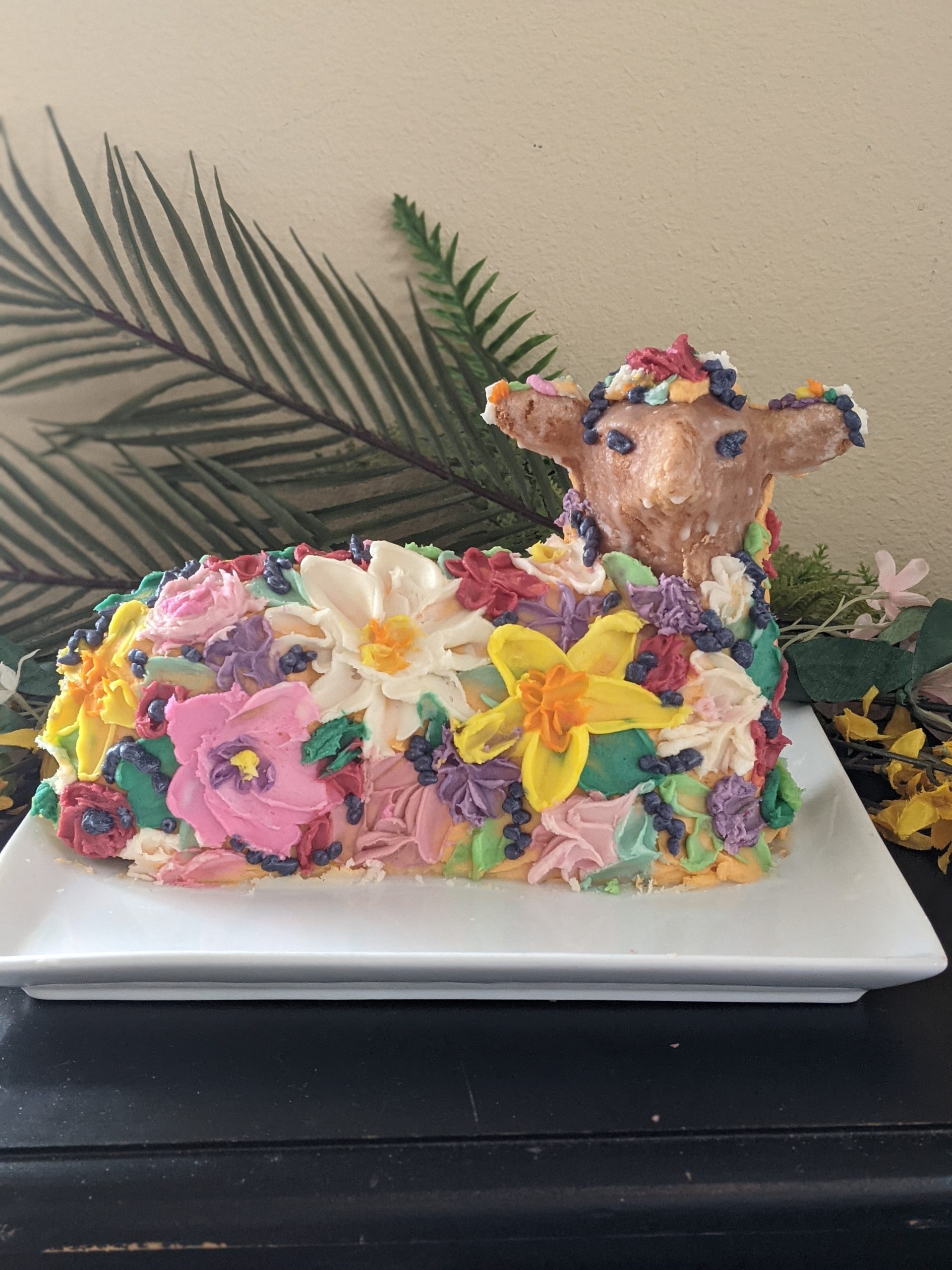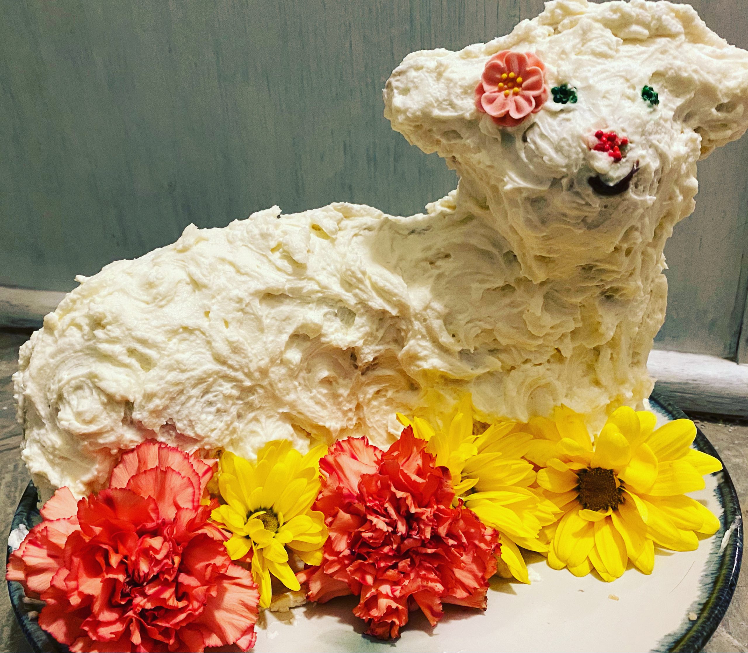 - cdarbygragg – I call it my Frida Kahlo Lamb Cake, because there has been so much interest in Frida Kahlo , the artist, this year. She always wore flowers in her hair. I made it with an old family recipe for pound cake, and vanilla butter cream frosting.