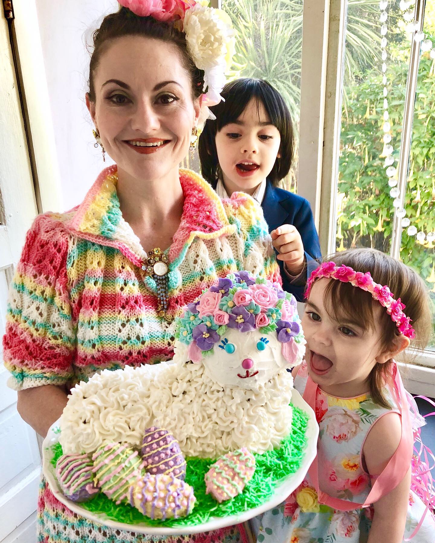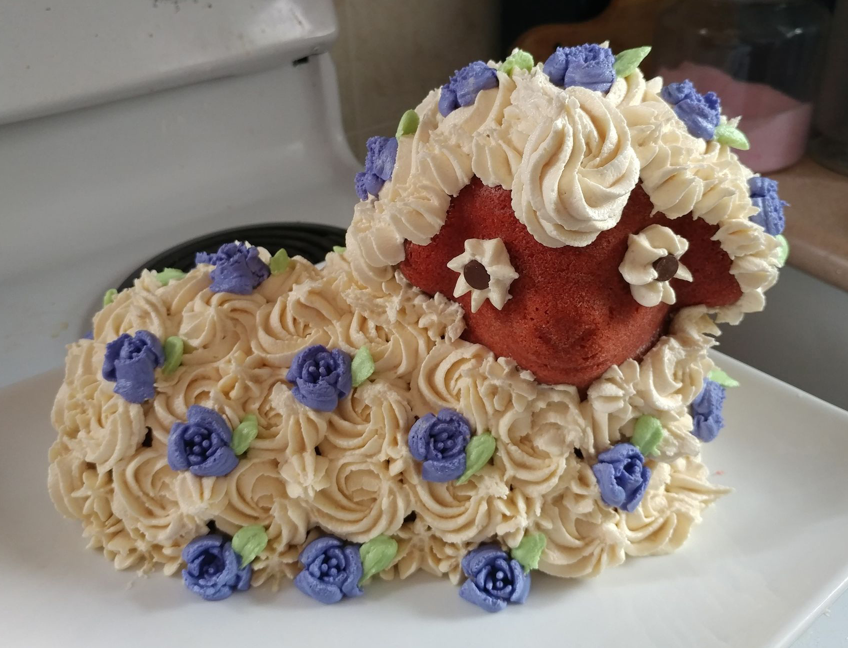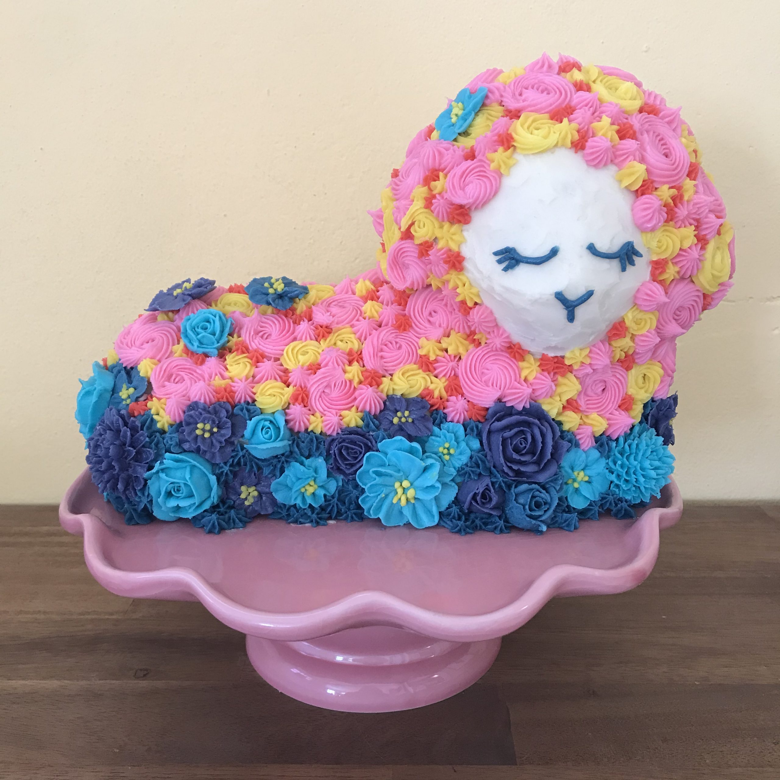 - cdarbygragg – I call it my Frida Kahlo Lamb Cake, because there has been so much interest in Frida Kahlo , the artist, this year. She always wore flowers in her hair. I made it with an old family recipe for pound cake, and vanilla butter cream frosting.