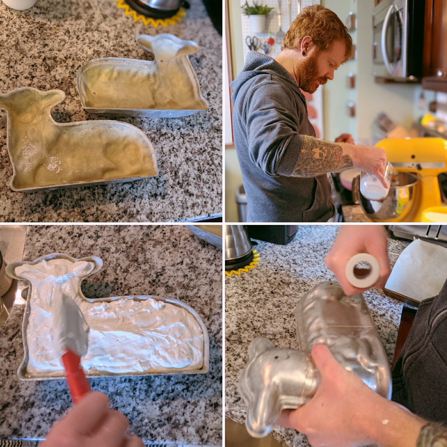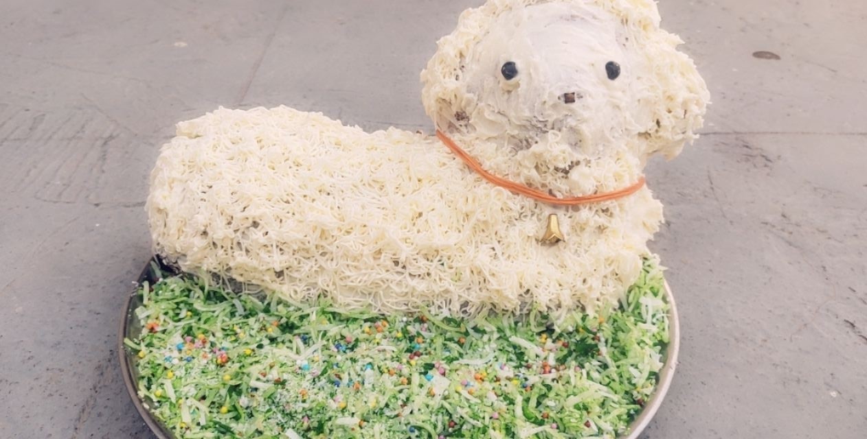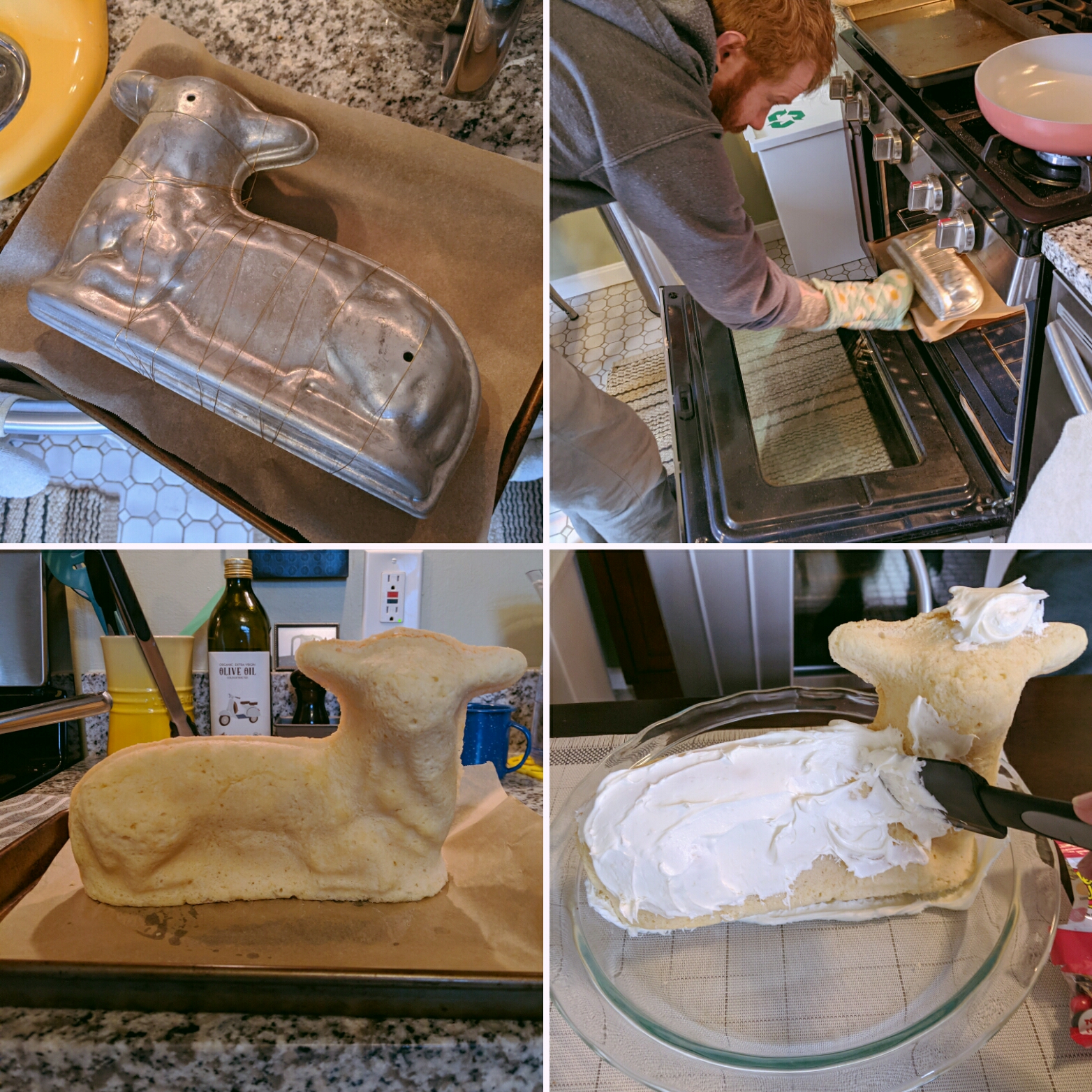 - Mallory Van Fossen – I wanted to submit this photo of my lamb cake for the lamb cake contest. The pan I use has been in my family for decades. We refer to it as a family legend. It survived an attempted heist, went missing for years, and resurfaced mysteriously in my mother’s possession recently… There are still some family members that don’t know I now have it (shhhh…!) It wouldn’t be Easter without this little guy. There are 2 collage photos that show each step, and one of the finished product.