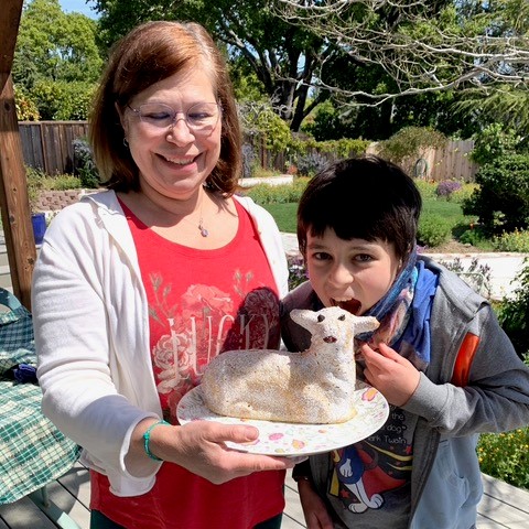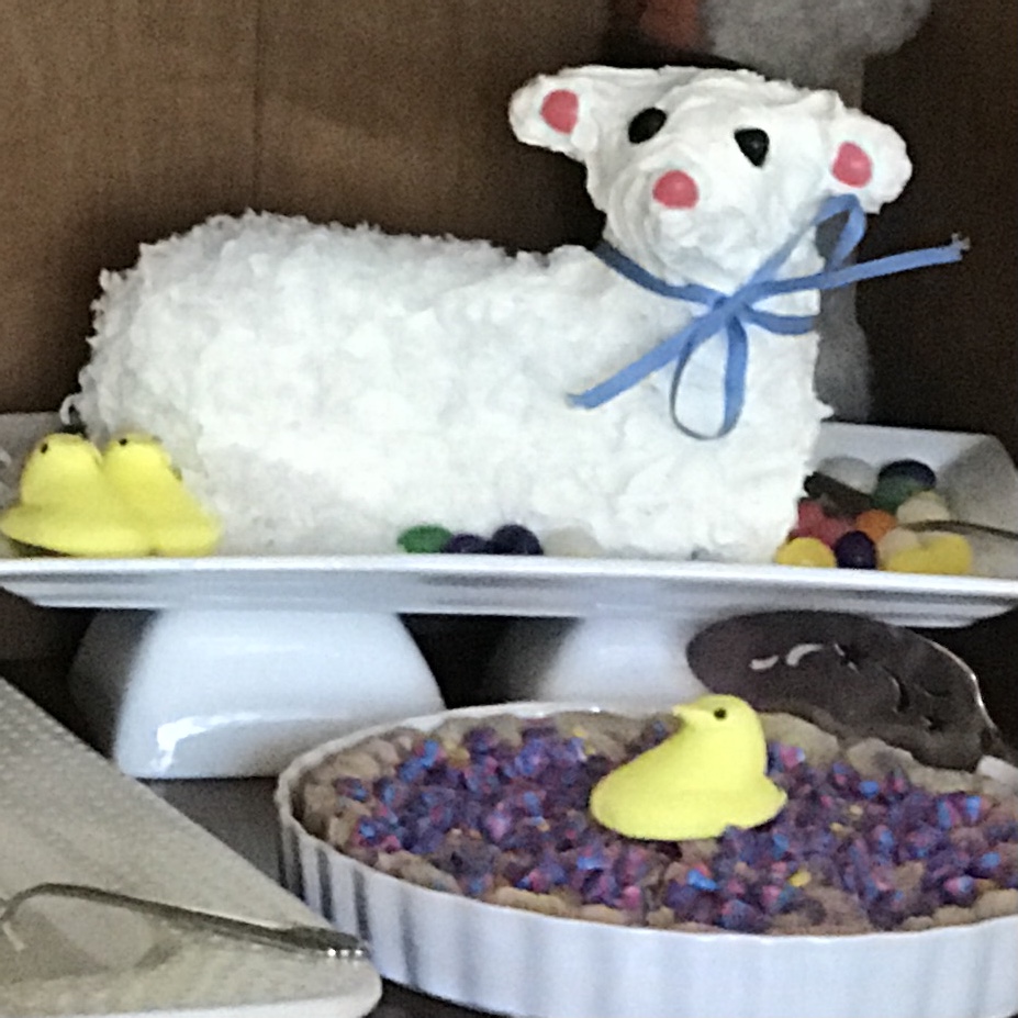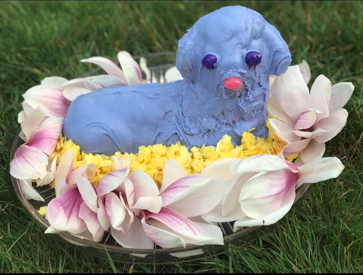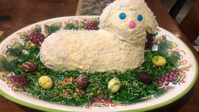 - Janice Bird Lamb Cake – With this past year being one of isolation, fear, tension and death for so many, including me, I decided this was the year to do a traditional lamb cake. Something familiar that would bring a smile to my friends and family. One exception is instead of the usual bell around her neck I used a heart shaped locket that my Dad gave to my Mom when they were High School sweethearts. When opened the locket has a photo of each of them from that time period…the 1940s. I make my lamb using a “pudding in the box” cake mix. I’ve learned how to make it without the use of toothpicks or dowels. It’s then iced with Wilton’s decorator frosting. This is the fist time my family will be together for a holiday since December 2019. Sadly, my sister died this past year. She loved all holidays! So I am dedicating my lamb cake to her.