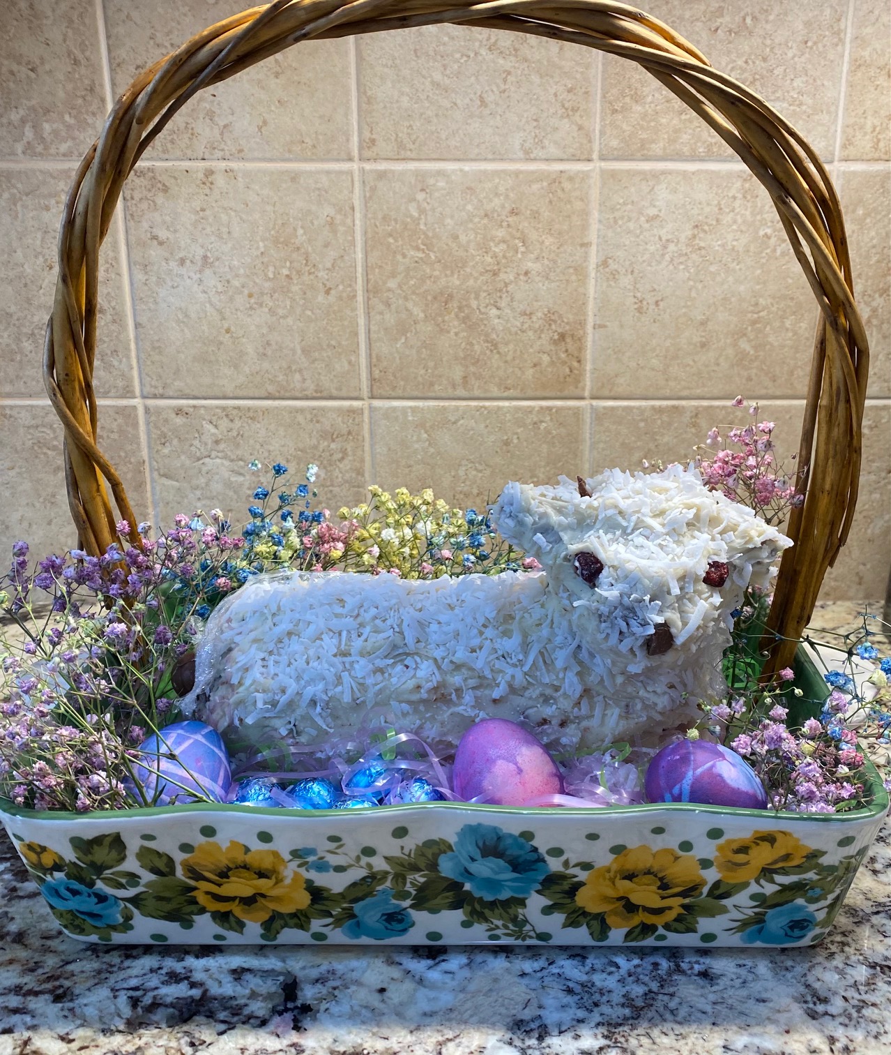 - Heather & Patrick Wall – My husband, Patrick, makes a lamb cake every year (like his grandmother). He’s tried a number of recipes for the cake but the icing is always the same, a real buttercream. Over the years we’ve found coffee beans to be the best eyes and nose. This year he had the proper attire for decorating! We greatly enjoy your blog!