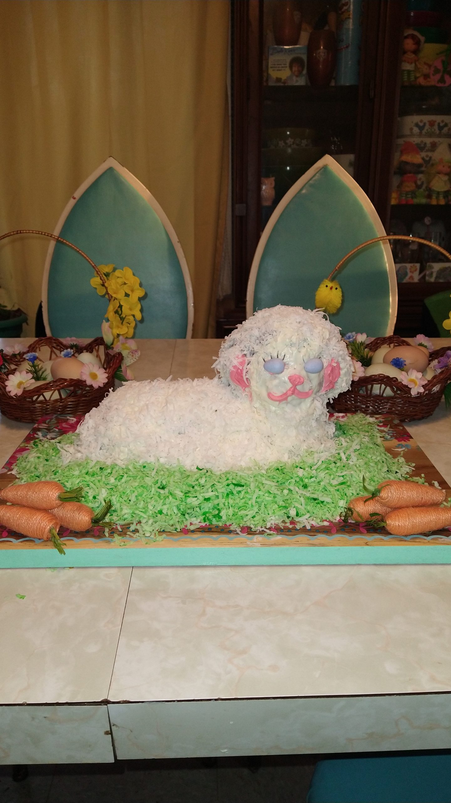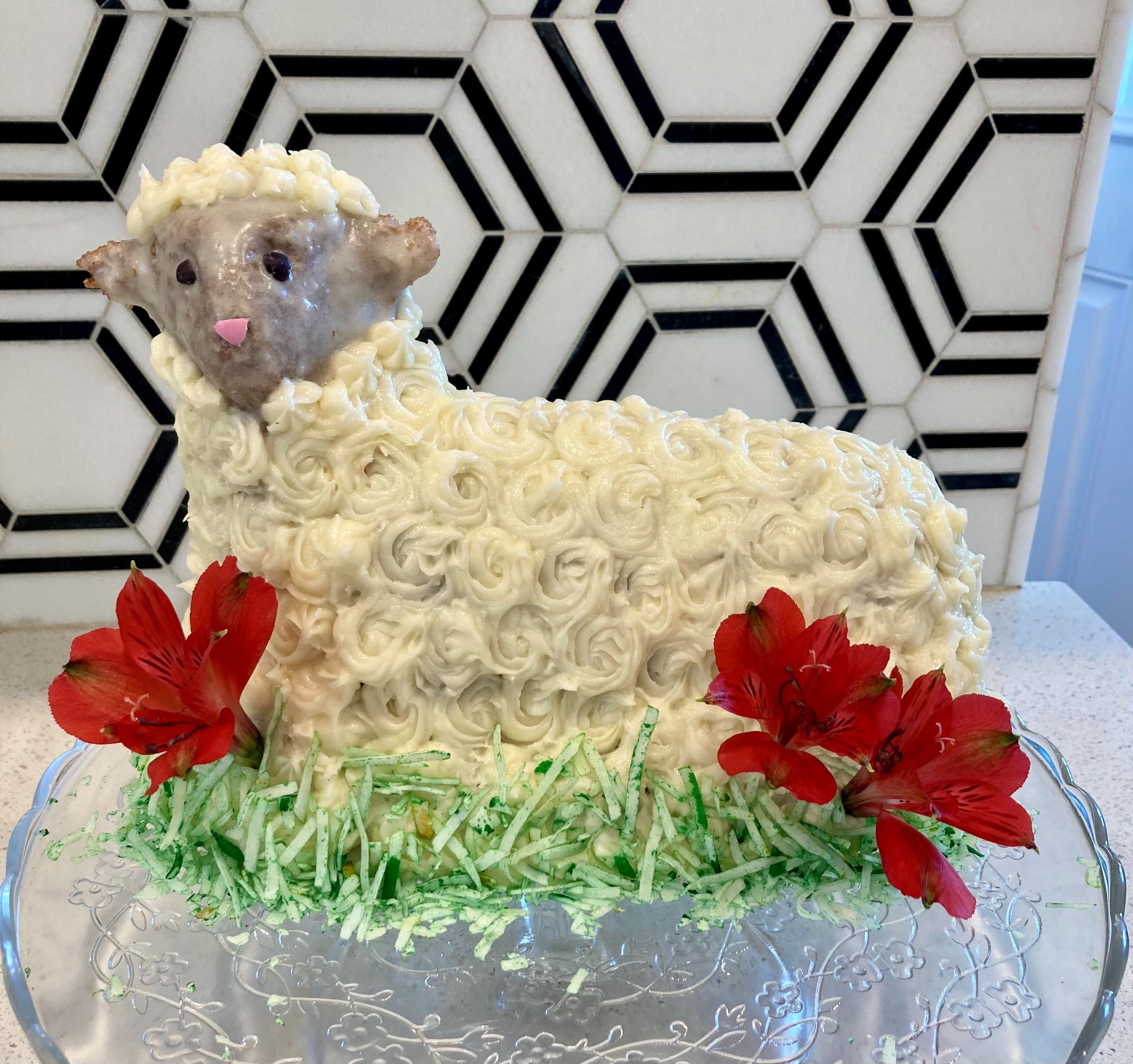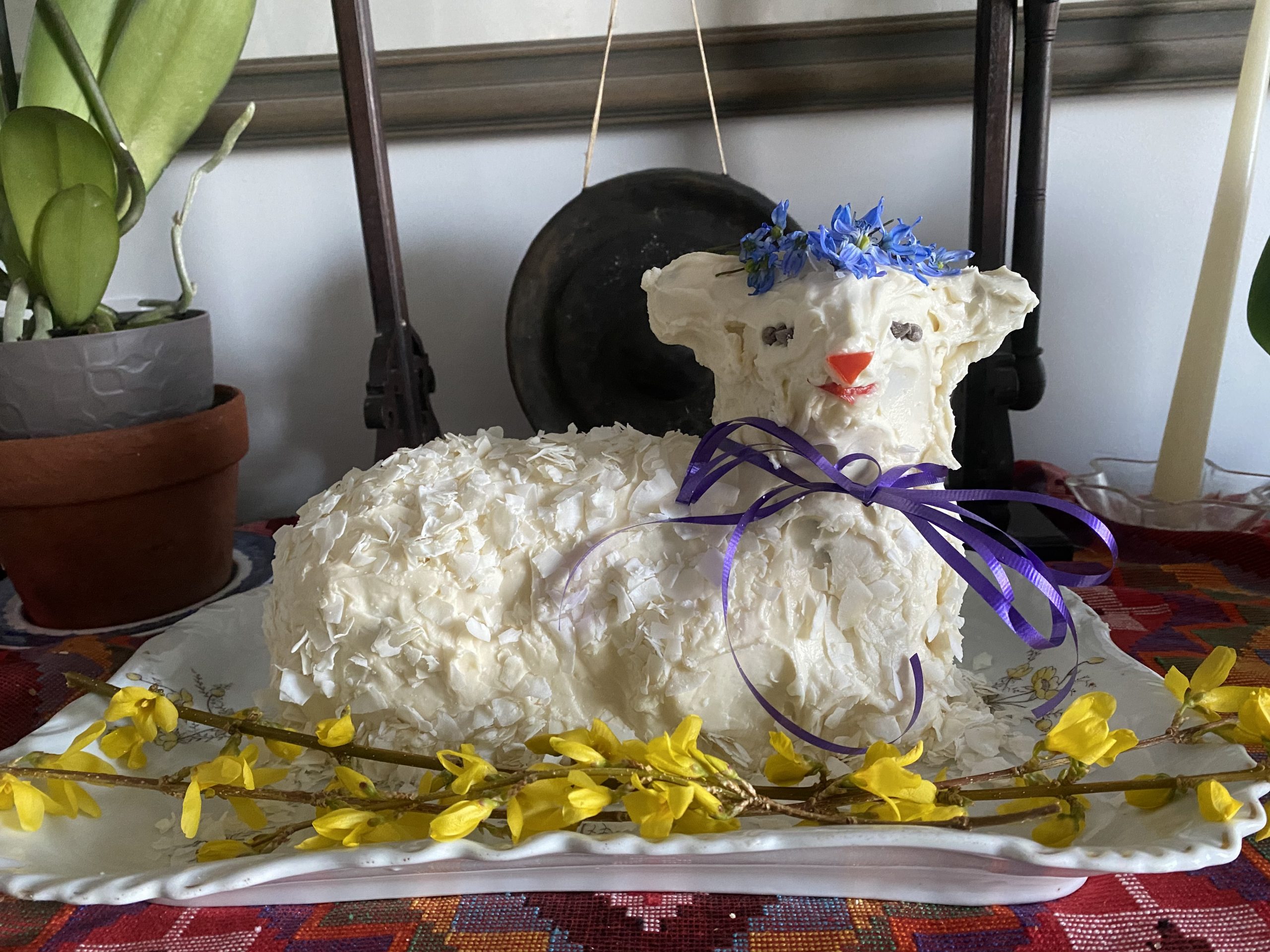 - Julia Cort – This is was our fifth Easter without our Mom Helen and the fifth of my carrying on her tradition of a Lamb Cake for Easter – all because of you and your fabulous blog and tutorial! Although our Mom always made a more traditional (and to be totally honest, usually dry) pound cake for her Lamb, I’ve stuck with a carrot cake recipe I found online in 2017 which is working well, and I actually think this year’s is my best bake so far. It has never quite risen through the back of the head, but everything else is perfect – it’s moist, tasty, and holds its shape well. (Thank you baked-in skewers & toothpicks!) I’m including a pic of the bare cooling lamb – with all the great details on display from my Mom’s Griswold mold – before I slathered it with lemon cream cheese frosting and coconut flakes. The 2021 carrot lamb cake is celebrating spring with flowers and radiating hope for the future. It’s also super healthy, because I used a red bell pepper for the nose and smile.