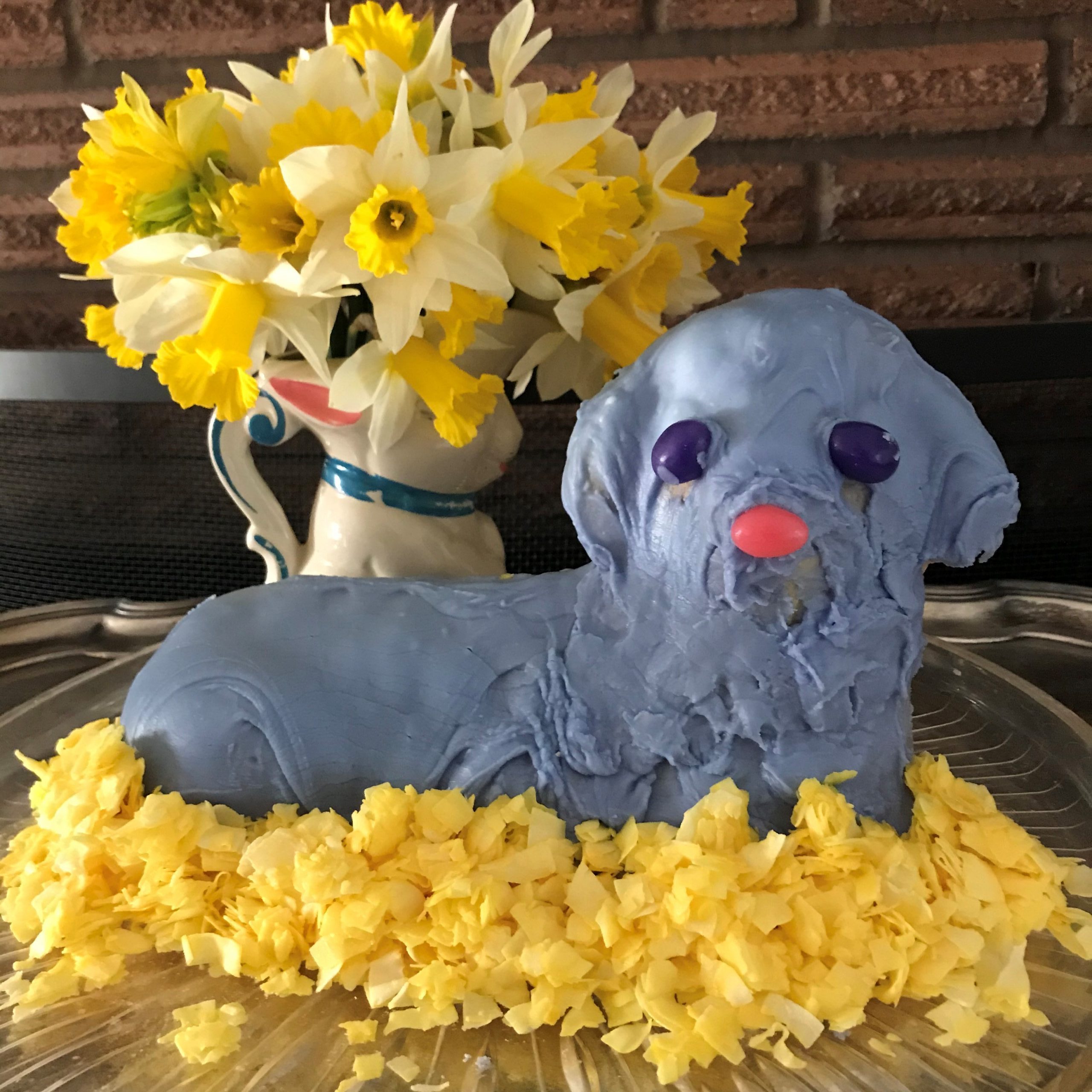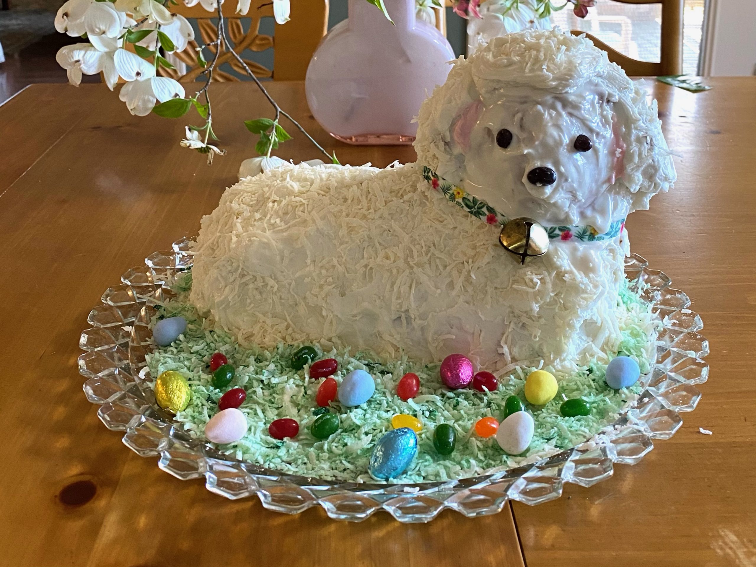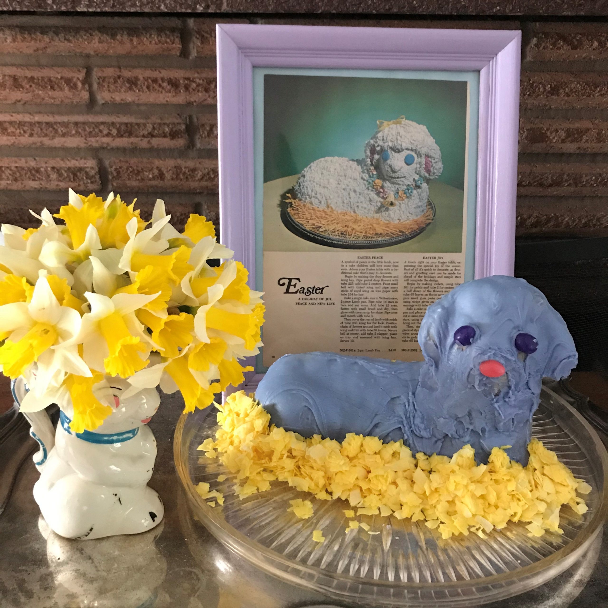- Julia Cort – This is was our fifth Easter without our Mom Helen and the fifth of my carrying on her tradition of a Lamb Cake for Easter – all because of you and your fabulous blog and tutorial! Although our Mom always made a more traditional (and to be totally honest, usually dry) pound cake for her Lamb, I’ve stuck with a carrot cake recipe I found online in 2017 which is working well, and I actually think this year’s is my best bake so far. It has never quite risen through the back of the head, but everything else is perfect – it’s moist, tasty, and holds its shape well. (Thank you baked-in skewers & toothpicks!) I’m including a pic of the bare cooling lamb – with all the great details on display from my Mom’s Griswold mold – before I slathered it with lemon cream cheese frosting and coconut flakes. The 2021 carrot lamb cake is celebrating spring with flowers and radiating hope for the future. It’s also super healthy, because I used a red bell pepper for the nose and smile.