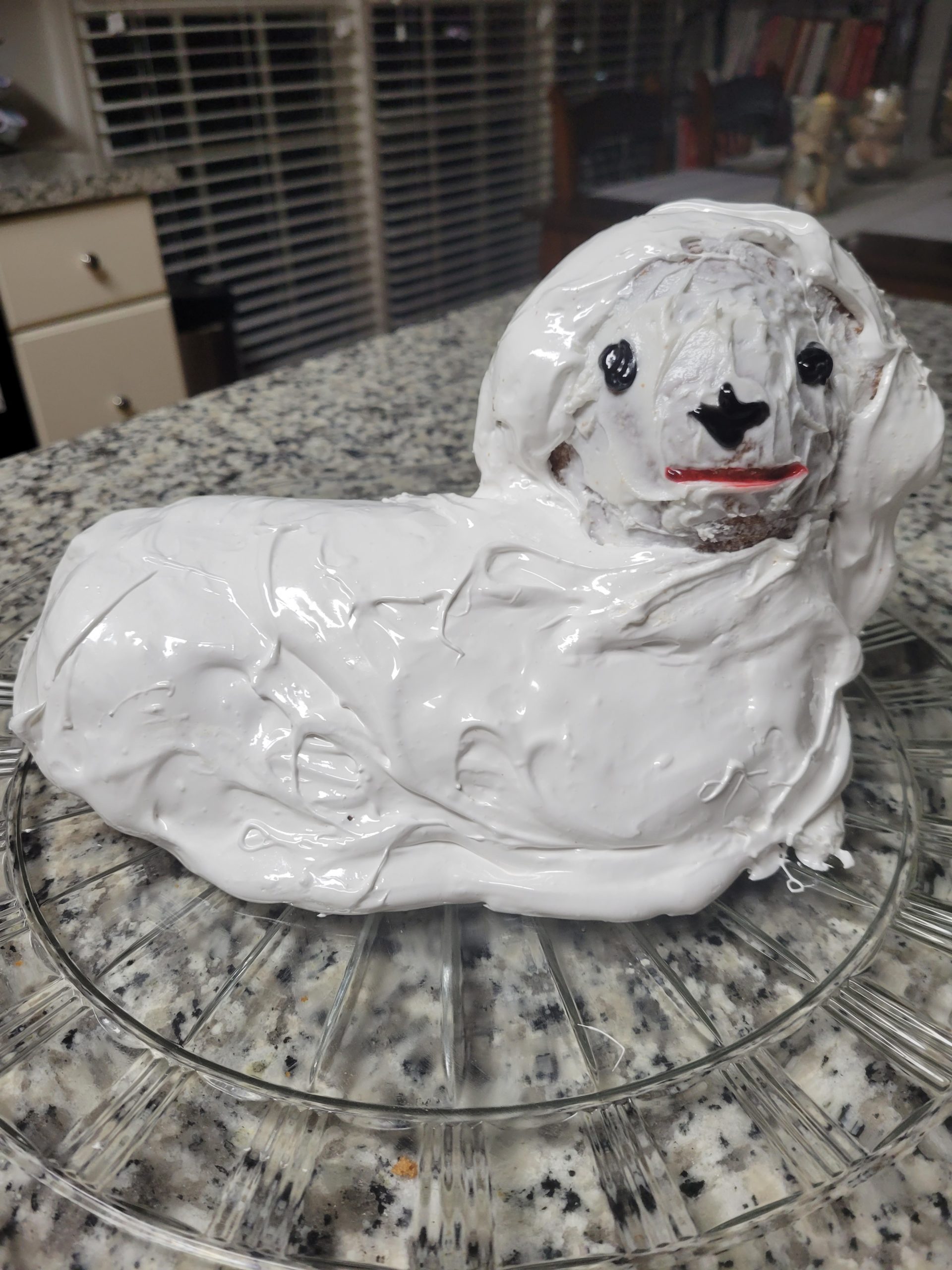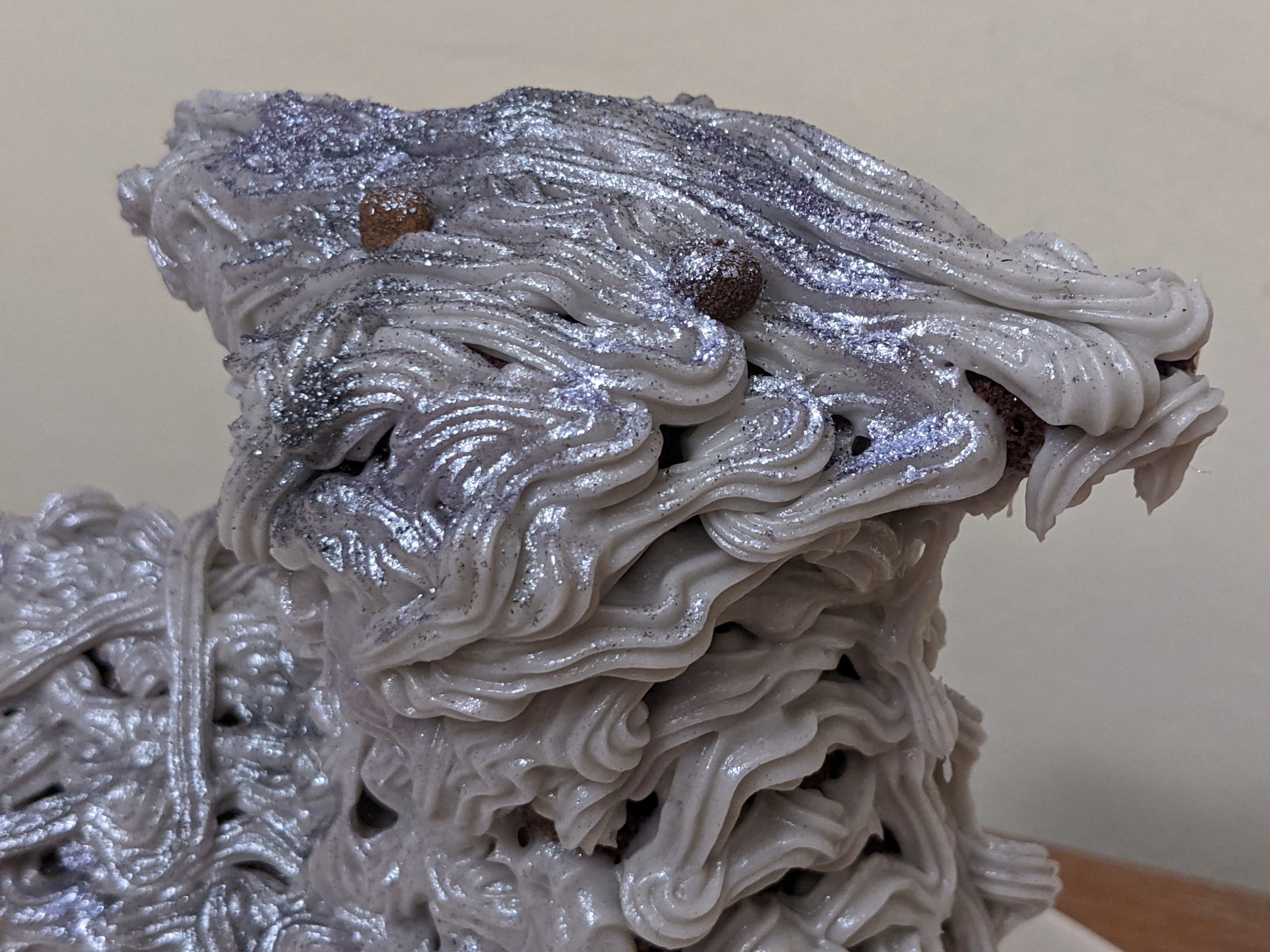 - Beth Harris – This was my first one ever. Used a recipe that wasn’t enough, so he had no formed backside because the cake didn’t go beyond the front half of the pan. I was discouraged at that point, although it came out of the pan wonderfully using your tips, so I decided not to frost him, but simply dusted with powdered sugar. The eyes are royal icing discs leftover from one of my cookie decorating orders, with the pupils done with a food color marker. And since I always seem to have royal icing made up, I popped some in a sandwich bag and haphazardly piped the mouth and nose, and added a sparkle to the eyes