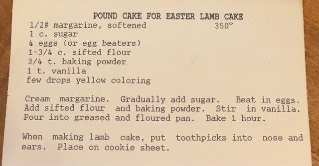 - Cynthia Schwendeman – We received the vintage lamb mold from my grandpa a few years ago. (With original recipe inside) With your tips this year finally turned out without decapitation. And your reviewed recipes were much better than the recipe provided. This was our best year ever! Thank you again for your dedication to lamb cakes. My mom loves it and this year we baked and decorated together.