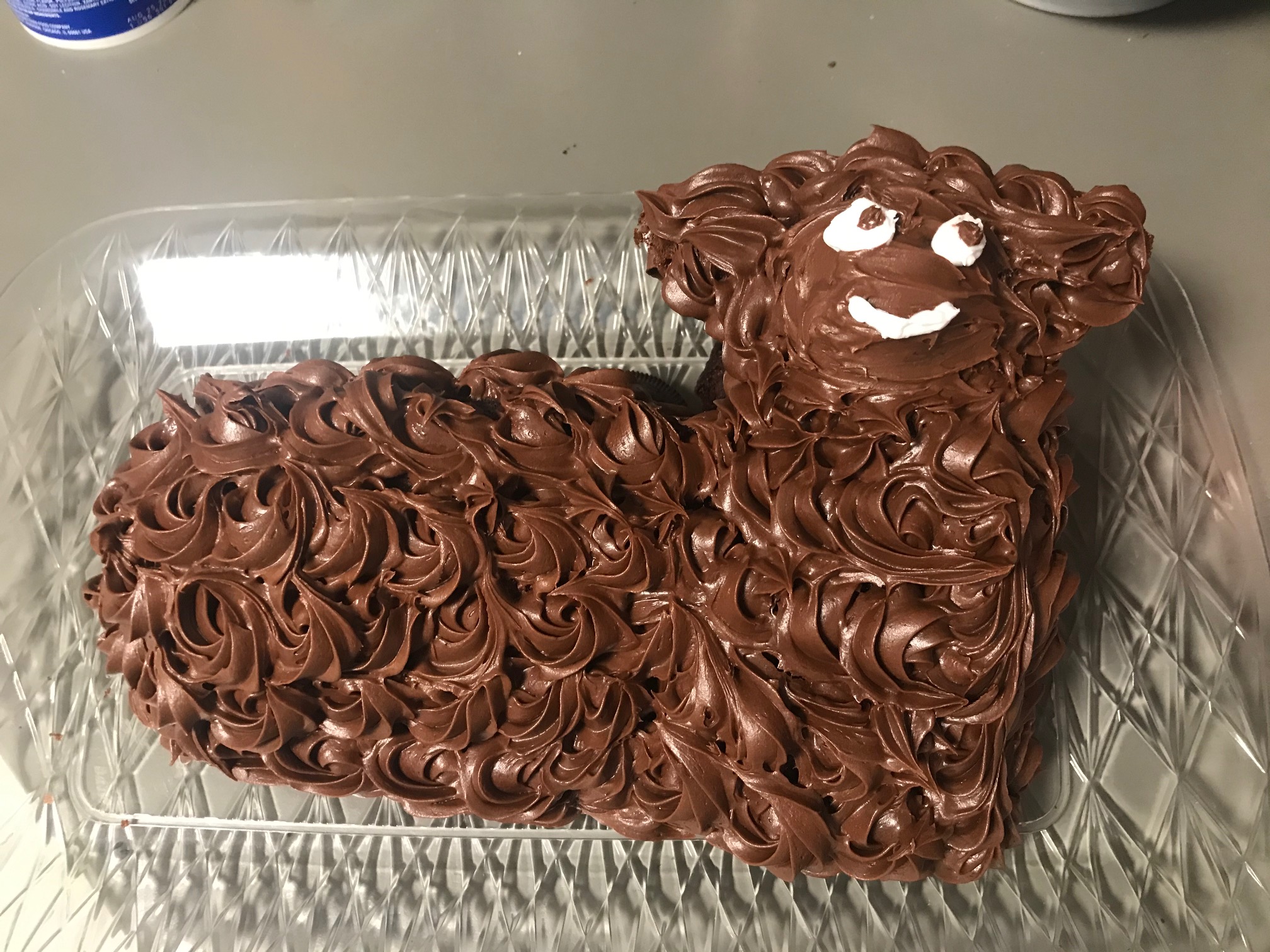 - Jeanie Tweedy – Here is my submission. It’s a chocolate cake with buttercream icing, a ganache covered face and dark chocolate mini eggs. I named her Fancy.