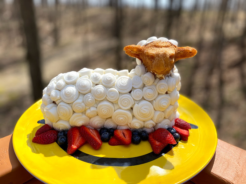 - Alex Nicholai – Here is my entry for your lamb cake contest. It’s a yellow cake with raspberry jam & vanilla frosting. Making it was a lot of fun! I don’t have any special pans, so I did carve the face out of pieces of cake that I stacked together & held in place with some skewers. Thank you for holding such a fun competition!