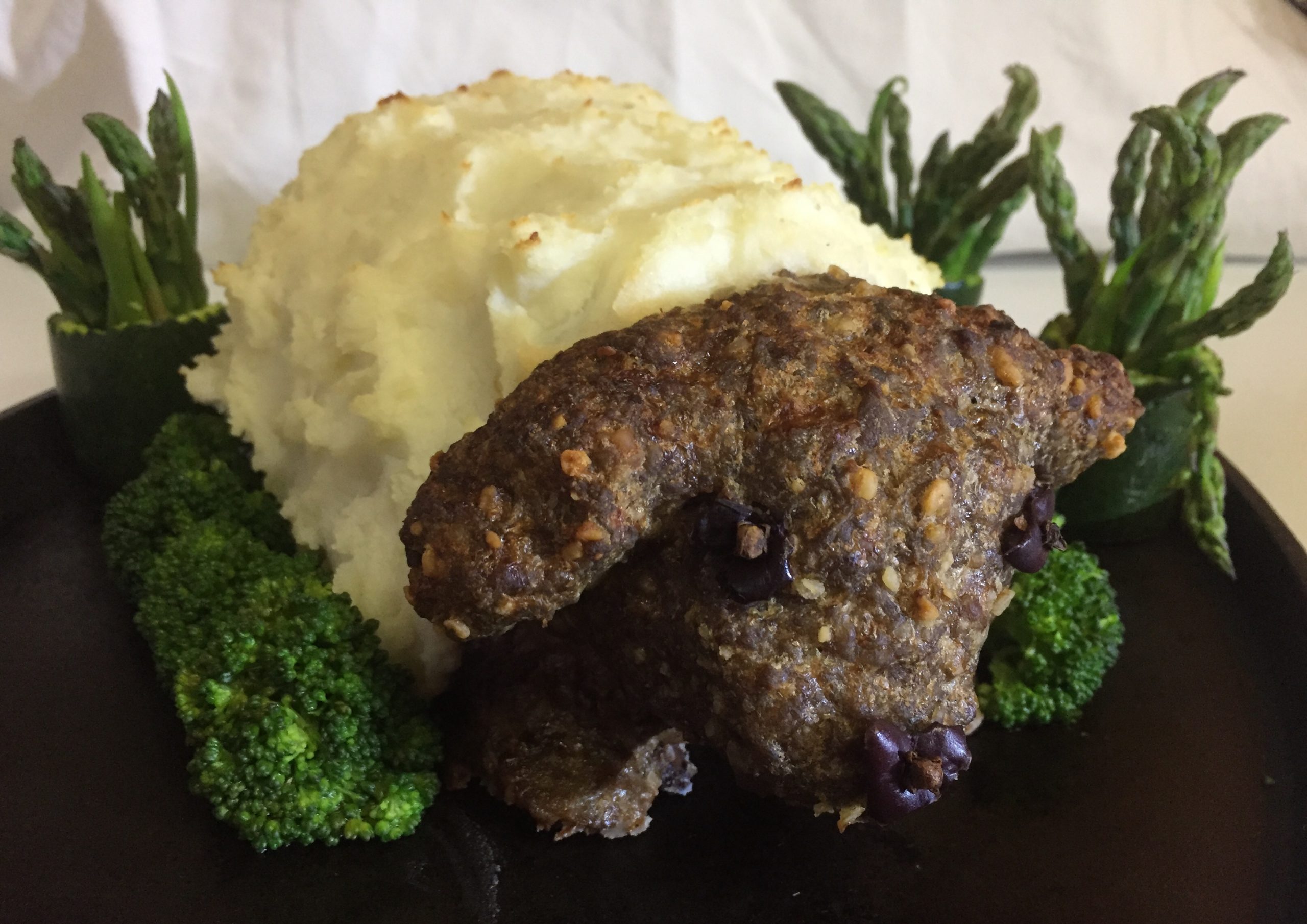 - Martha Stevens – This is my hand-shaped lamb meatloaf with mashed potatoes fleece and olive and whole clove eyes and nose. The spring garden is made of steamed broccoli florets and zucchini cups filled with asparagus tips. Lamb Meatloaf 1.75 – 2 lbs. ground beef 1/2 C. breadcrumbs (I used panko-style gluten-free breadcrumbs) 1/3 C. Milk or more as needed to soak breadcrumbs 1 tsp. Salt 1/4 Tsp. Pepper 1 Large Egg, lightly beaten 2.5 ounces of breakfast or uncooked, loose sausage 1 T. Worcestershire Sauce 1 tsp. Tomato Paste For Decorating the Lamb Meatloaf 2 pounds of prepared mashed potatoes 2 or 3 Kalamata Olives and whole cloves for the eyes and nose. Assorted spring vegetables, lightly steamed Soak breadcrumbs in milk. Add the egg and other ingredients and blend well with a fork, then with your hands. If needed, before shaping the meatloaf, chill in the refrigerator to firm up the mixture. Use a greased baking dish or line a rimmed baking sheet with parchment baking paper. The dish should be able to hold the hot juices, but allow some air space around the meat so that it browns evenly. Form your lamb. If needed, you can brace the head with crumpled parchment paper. Bake at 325 F. until cooked through and browned, about 1.25 hours. When ready to serve, top with mashed potatoes and if desired, lightly brown the mashed potatoes under a broiler at 375 F. for a few minutes or use a hand-held torch. Remove from the oven. Allow to rest for about fifteen to twenty minutes before adding the eyes and nose and transfering to a serving platter. Surround with steamed vegetables.
